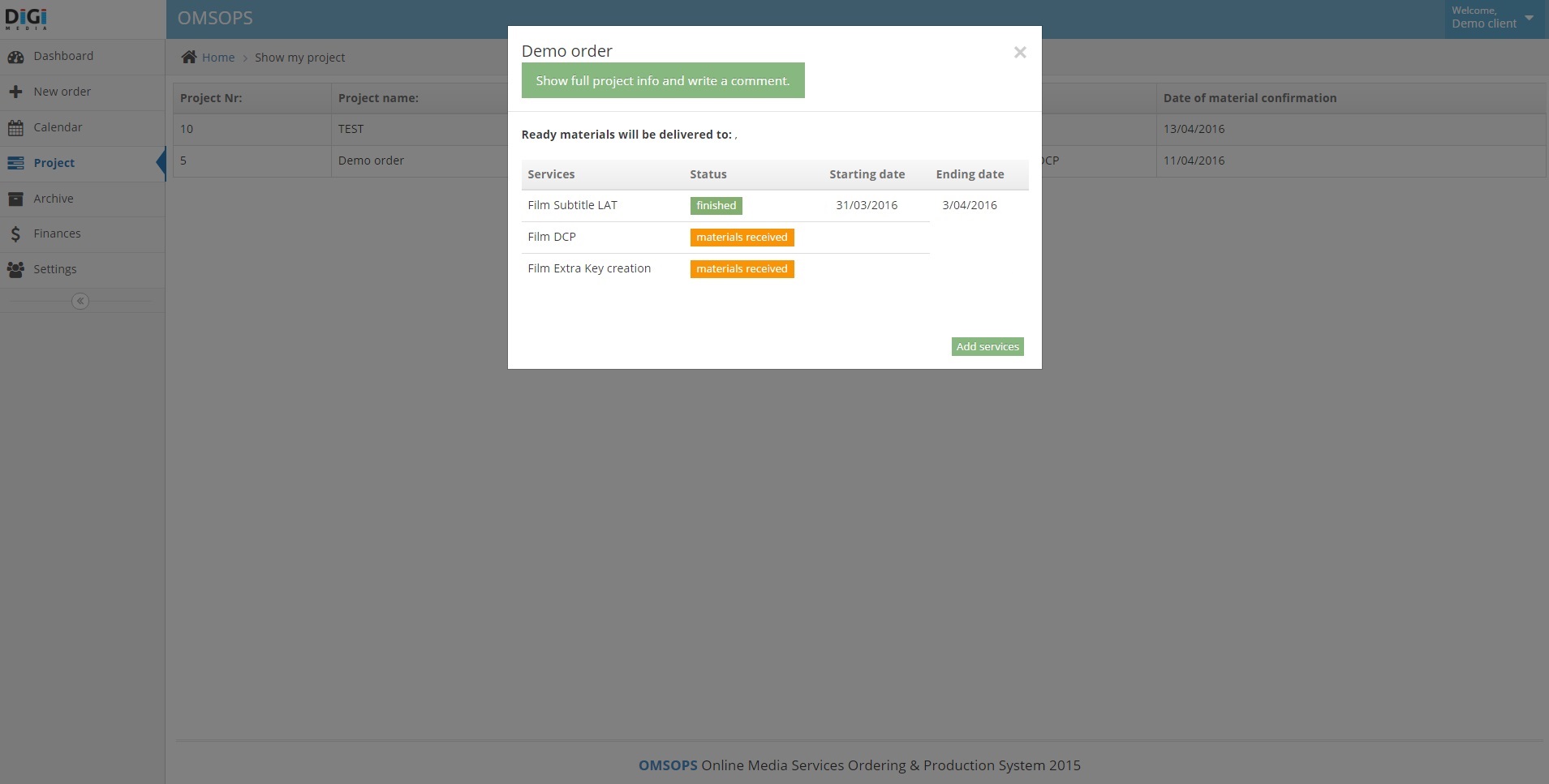 - pārskatīt pasūtījuma detaļas – pārbaudīt kādā statusā ir projekts, papildināt to ar jauniem vai trūkstošiem pakalpojumiem, vai veicot tajā labojumus;